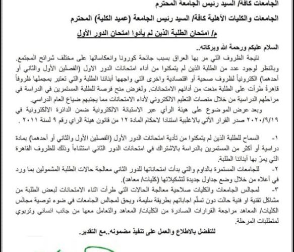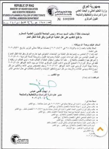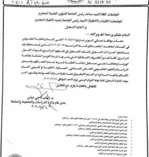 حصلت موافقة وزير التعليم العالي والبحث العلمي بتاريخ 13/ 2020/8 بالسماح للطلبة المقبولين في الكليات والجامعات كافة للسنة الدراسية 2019 – 2020 الذين لم يسجلوا ولم يكملوا إجراءات التسجيل بإعادة التسجيل في قبولهم وعلى جميع قنوات القبول وذلك تقديراً للظروف الاستثنائية التي يمر بها بلدنا العزيز. كل التوفيق لجميع طلبتنا الأعزاء..
