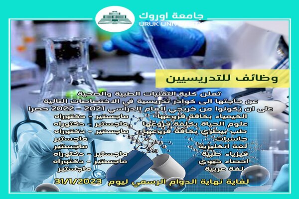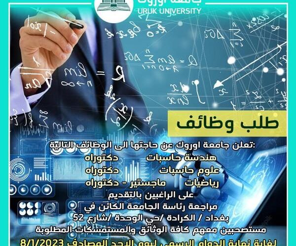 تعلن جامعة اوروك عن حاجتها الى الوظائف التالية