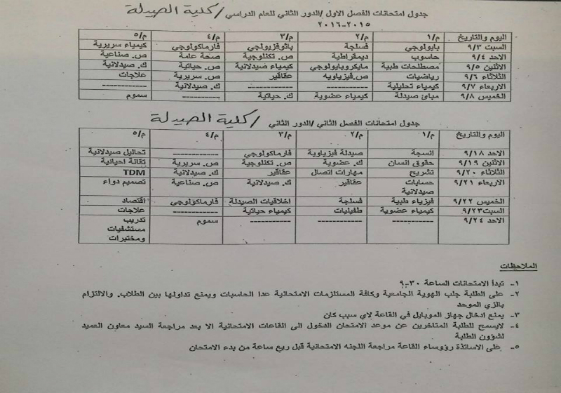 تعلن كلية الصيدلة جامعة أوروك عن بدء إمتحانات الفصل الاول – الفصل الثاني / الدور الثاني للعام الدراسي 2016/2015 يوم السبت المصادف 3/9 ولغاية يوم الخميس 8/9