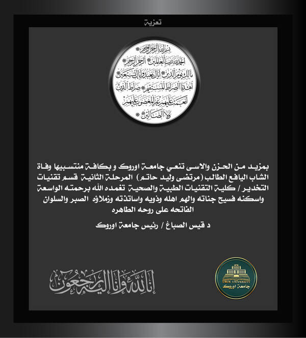 بمزيد من الحزن والاسى تنعي جامعة اوروك و بكافة منتسبيها وفاة الشاب اليافع الطالب (مرتضى وليد حاتم) المرحلة الثانية قسم تقنيات التخدير / كلية التقنيات الطبية والصحية تغمده الله برحمته الواسعة واسكنه فسيح جناته والهم اهله وذويه واساتذته وزملاؤه الصبر والسلوان